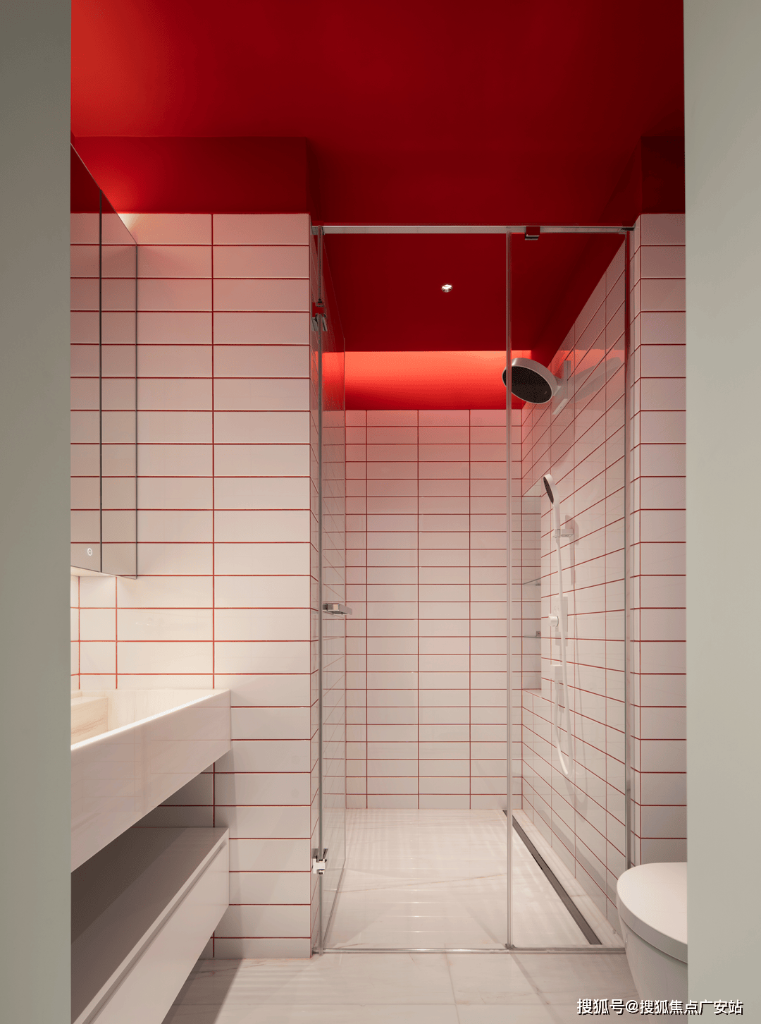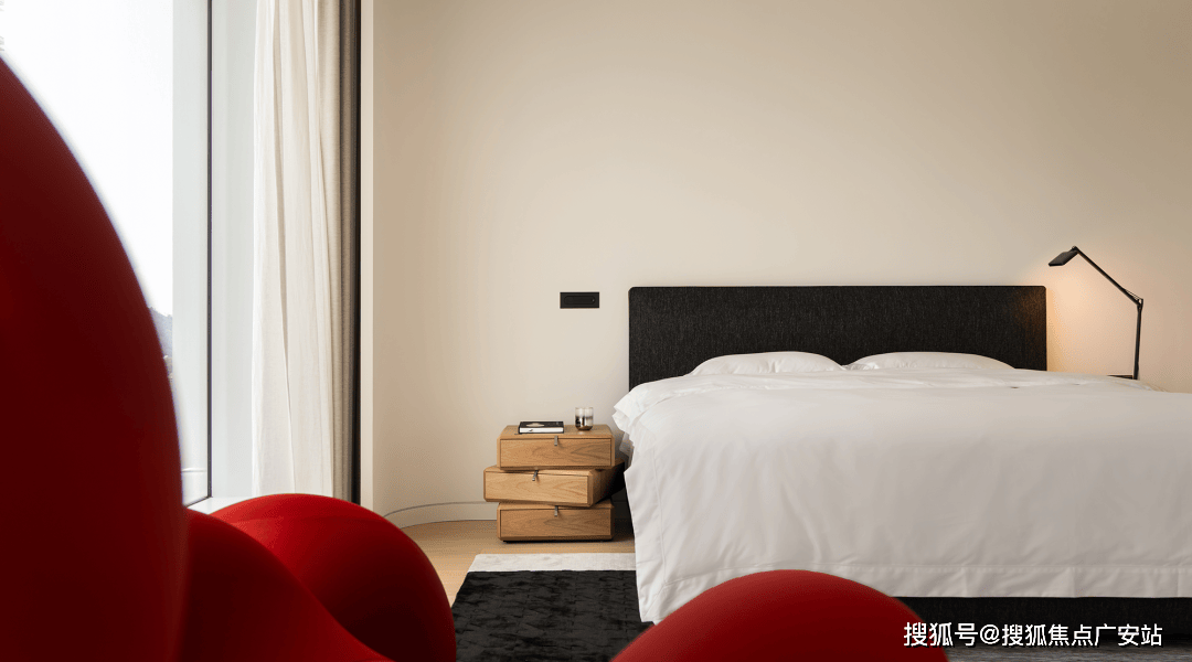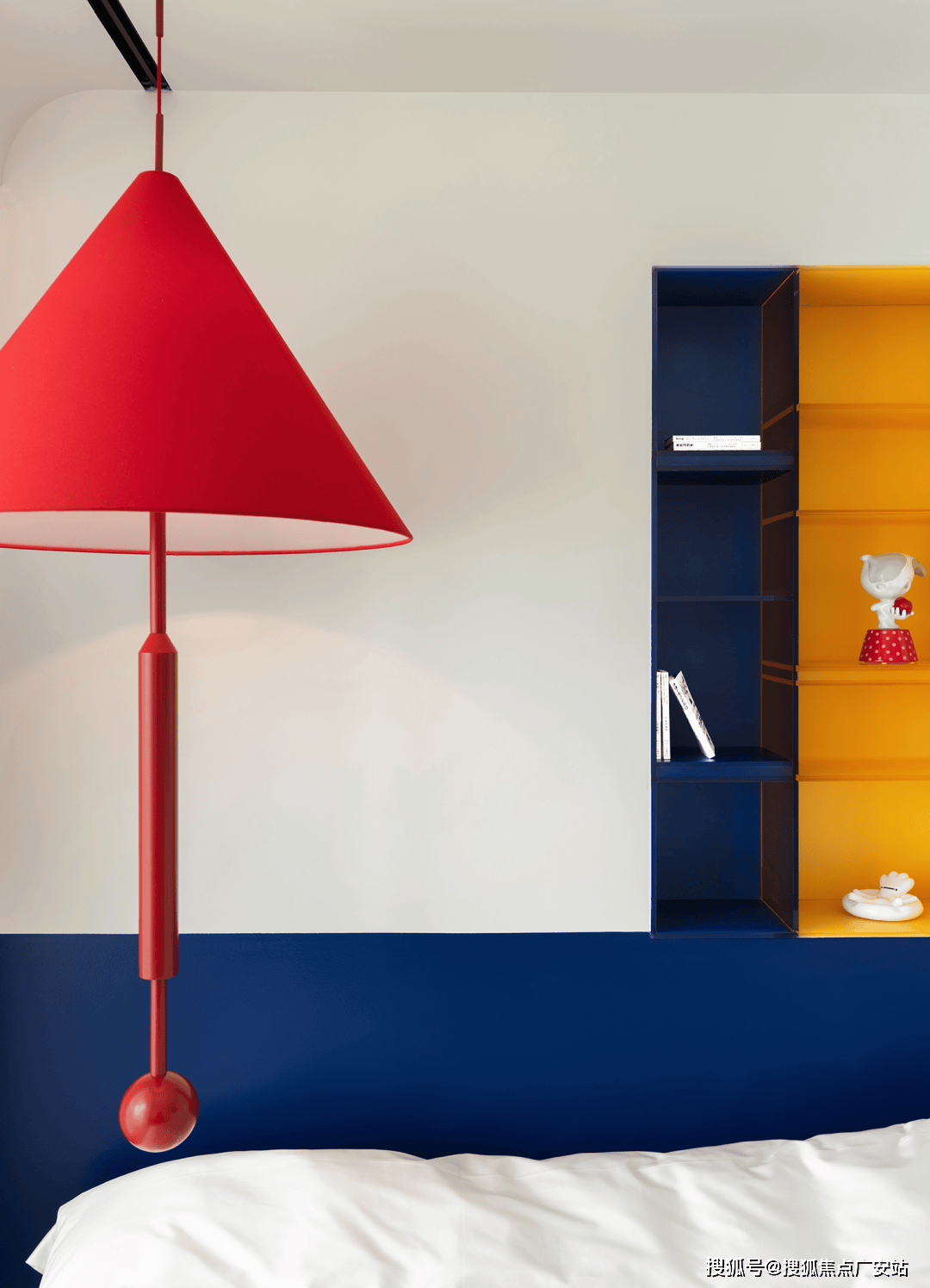 房间以的白色为基调,营制出敞亮通透的空气,而红、黄、蓝三色则以几何块面的形式巧妙点缀此中,仿佛蒙德里安画做中的色块跃然于现实空间。