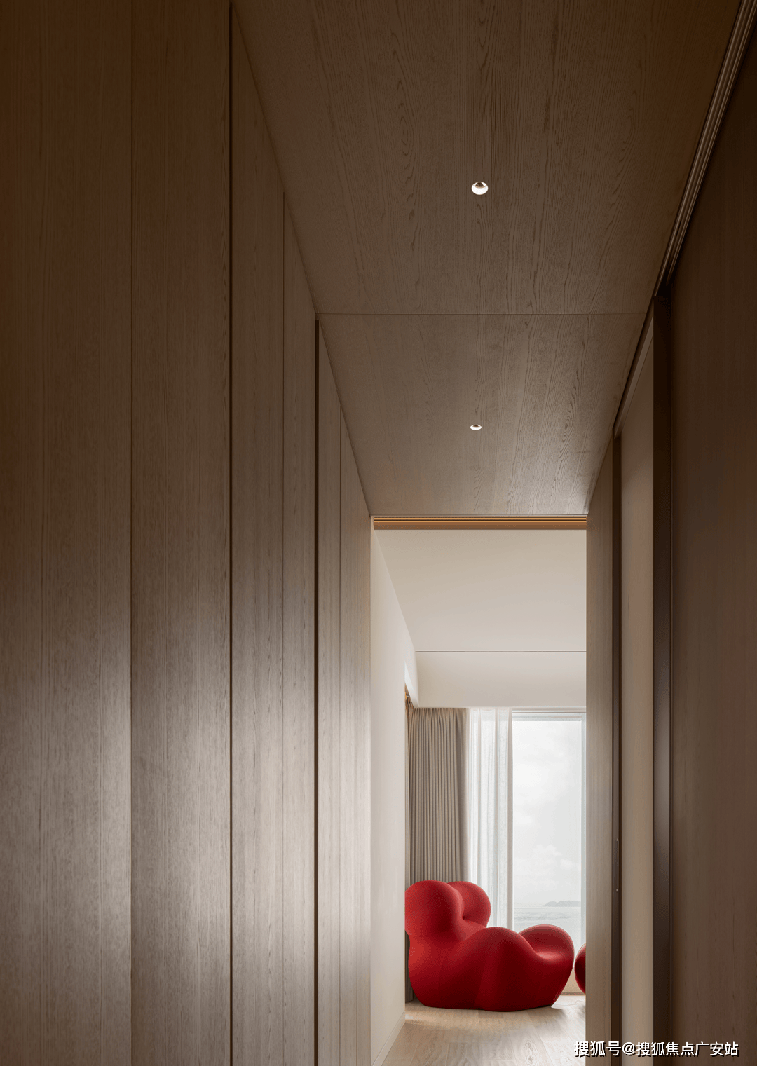 这是一条由木质储纳柜形成的幽长过道,柜体采用温暖的浅木色调,概况纹理细腻,分发着天然的朴实气味。简练的柜门,躲藏着丰硕的储物空间,更通过过道的设想巧妙地添加了卧室的私密度。