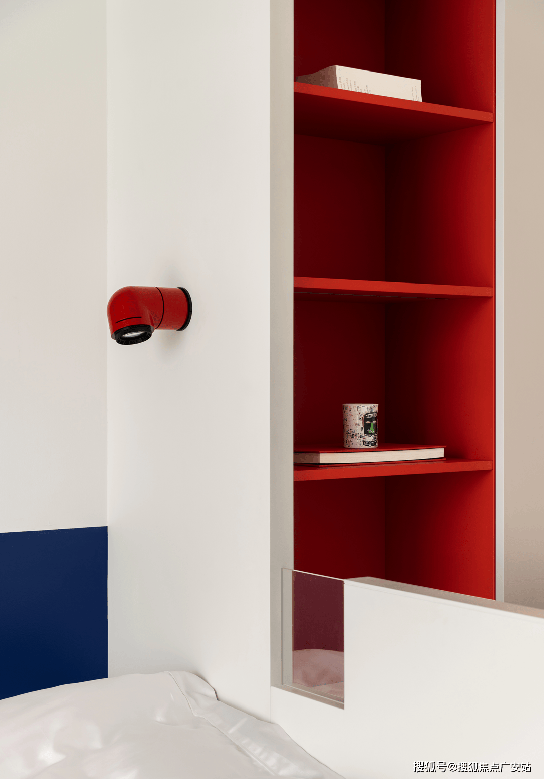 房间以的白色为基调,营制出敞亮通透的空气,而红、黄、蓝三色则以几何块面的形式巧妙点缀此中,仿佛蒙德里安画做中的色块跃然于现实空间。