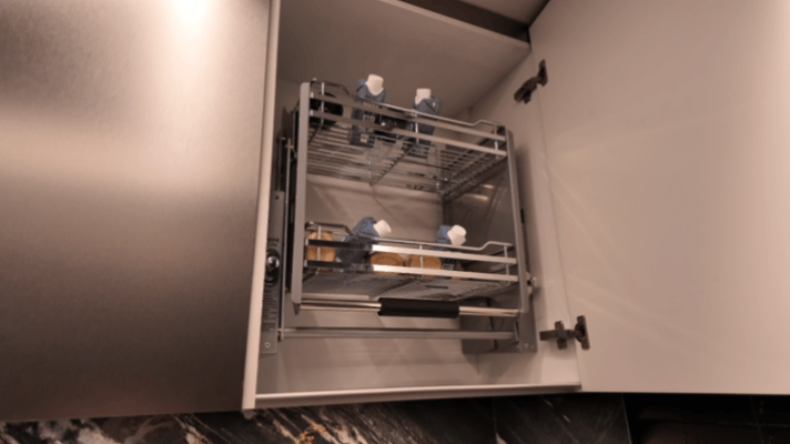 燃气灶下方做好分区的抽屉和轻松抽。台面边缘做了必然角度的斜切,如许即便滴水也不会漏至下方的柜体之中。