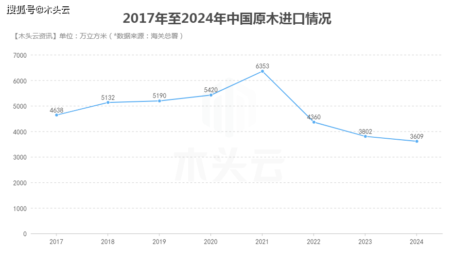 我国做为全球木材市场的环节参取者,其原木消费量取进口量均位居世界前列。正在原木材种消费布局上,针叶阔叶占比大体相当。 2024年,中国原木进口量达到3609万立方米,这一数字